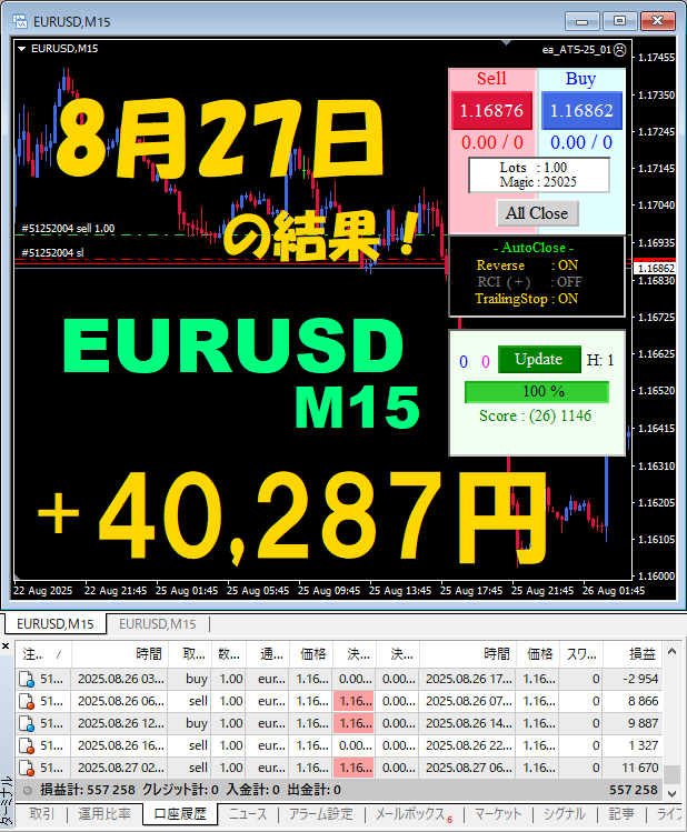 【EURUSD M15】前日の結果『ATS-25』 8月27日