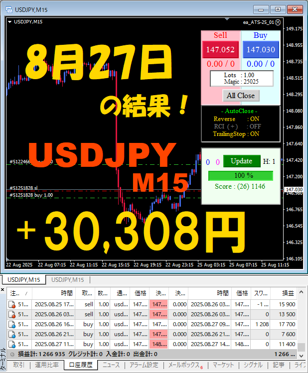 【USDJPY M15】前日の結果『ATS-25』 8月27日