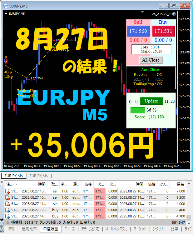 【前日の結果】EURJPY M5 『ATS-25』8月27日
