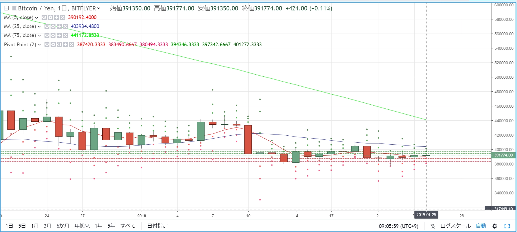 画像は2019年1月26日のキャプチャ。昨日は全面的に「緑」に転じていましたが、その上昇の度合いはわずかで、もみ合いの様相を呈していました。今日は1~2%の下落となり、昨日よりも弱気な相場環境となっています。