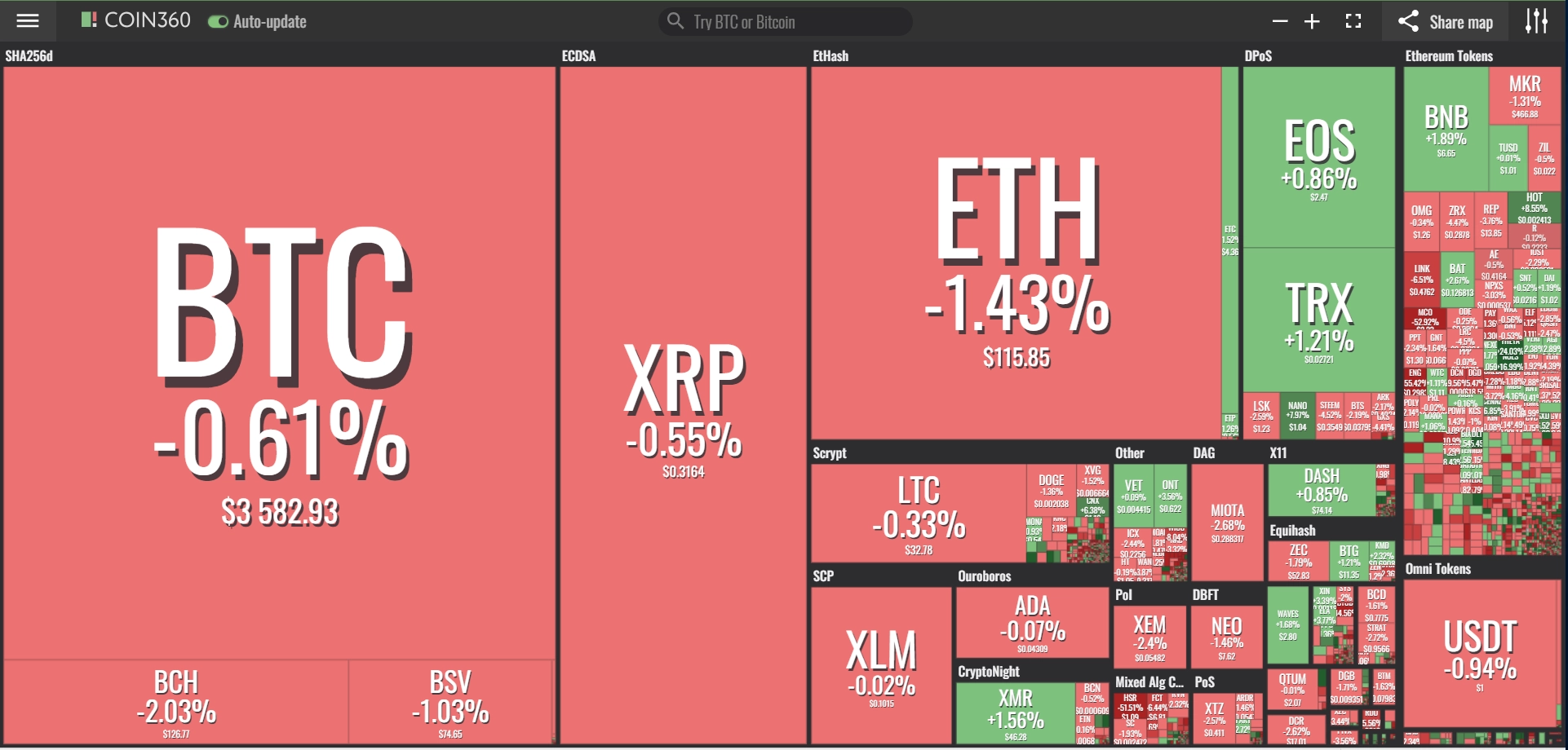 coinmarketcap(コインマーケットキャップ)のサイトから、ドミナンス(各銘柄が仮想通貨全体の時価総額に占めるパーセンテージ)を定点観測していきます。仮想通貨全般が下方向に大きく動き出している相場状況を受け、毎日更新することとし、仮想通貨業界を俯瞰および転換期を早期に発見することを目的とします。