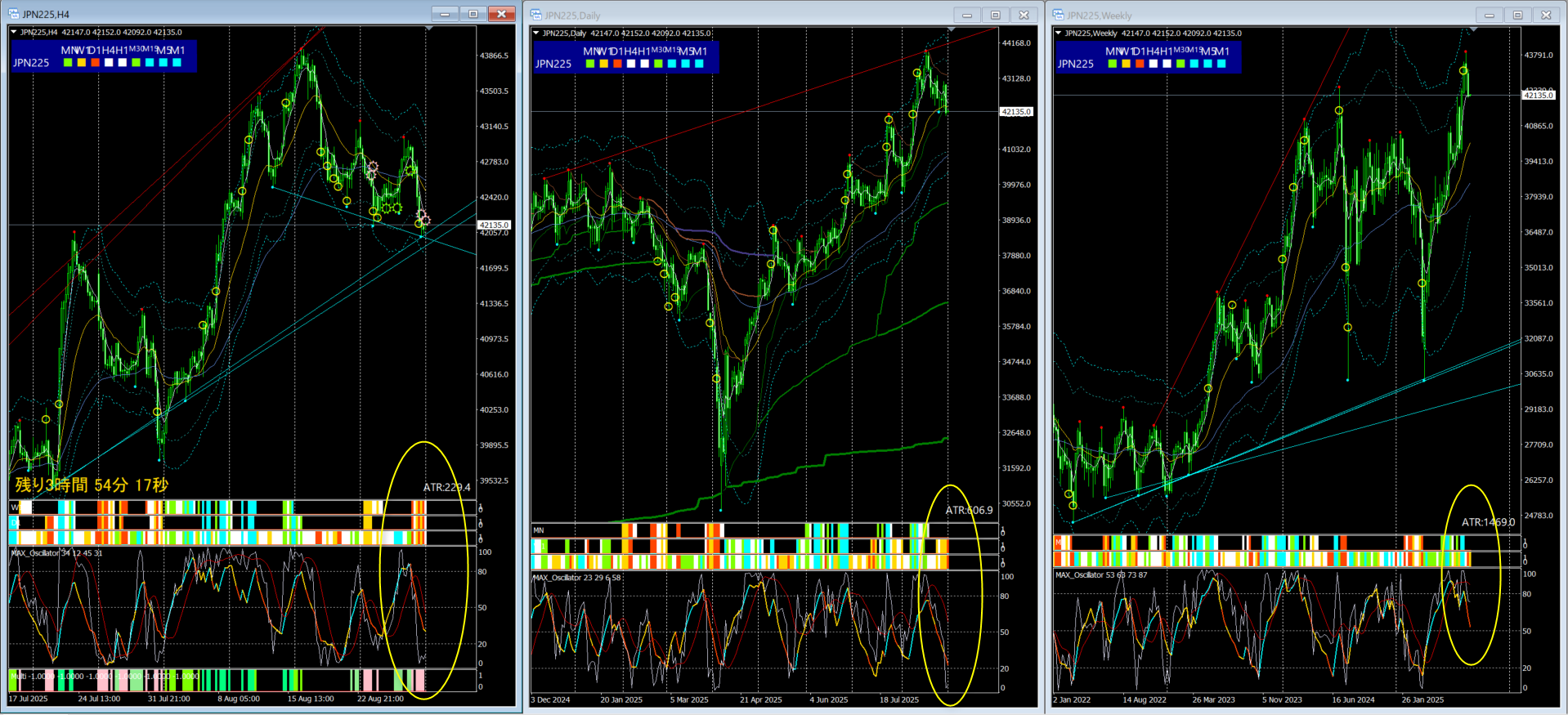 日足のMAXオシレーター・シンクロバンドは現在は「弱い下落」に変化