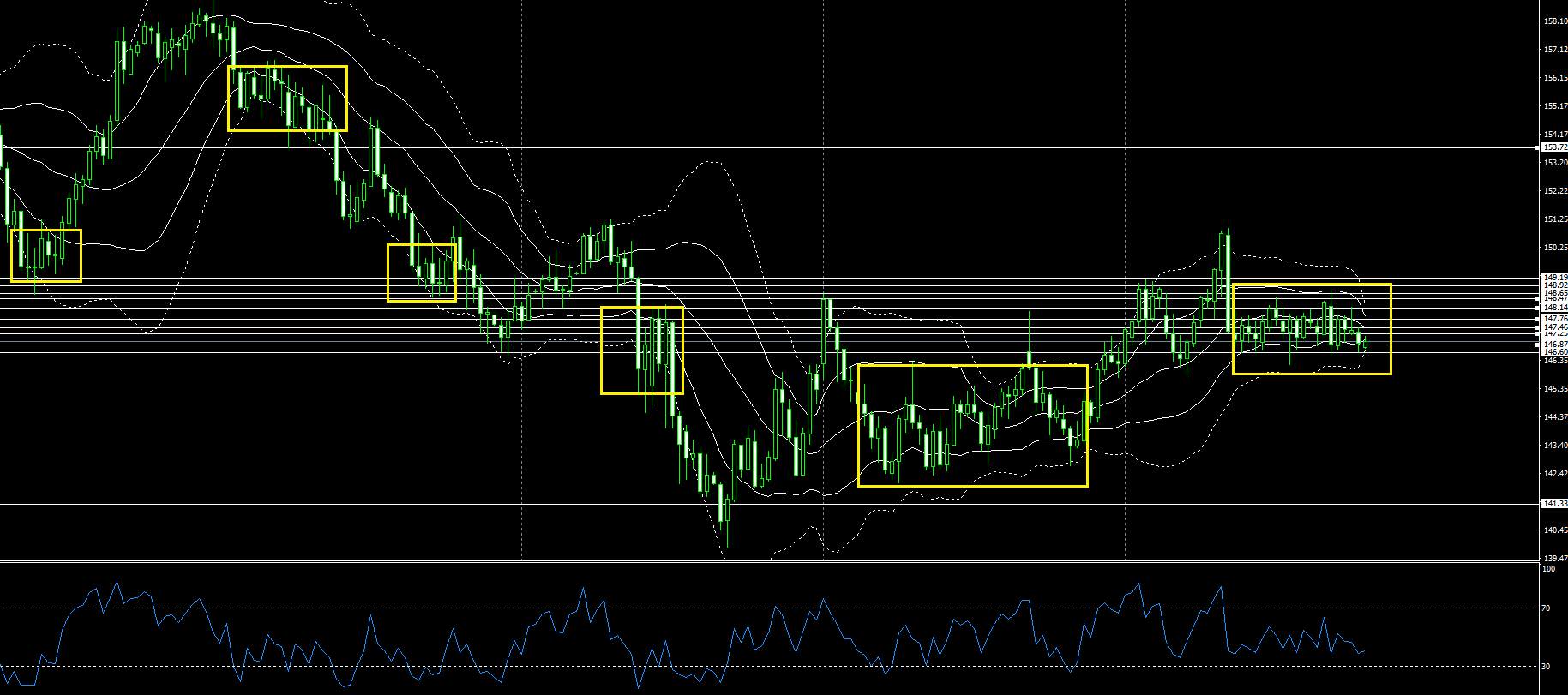 一番右の黄色□ゾーンが現在レンジのドル円です。