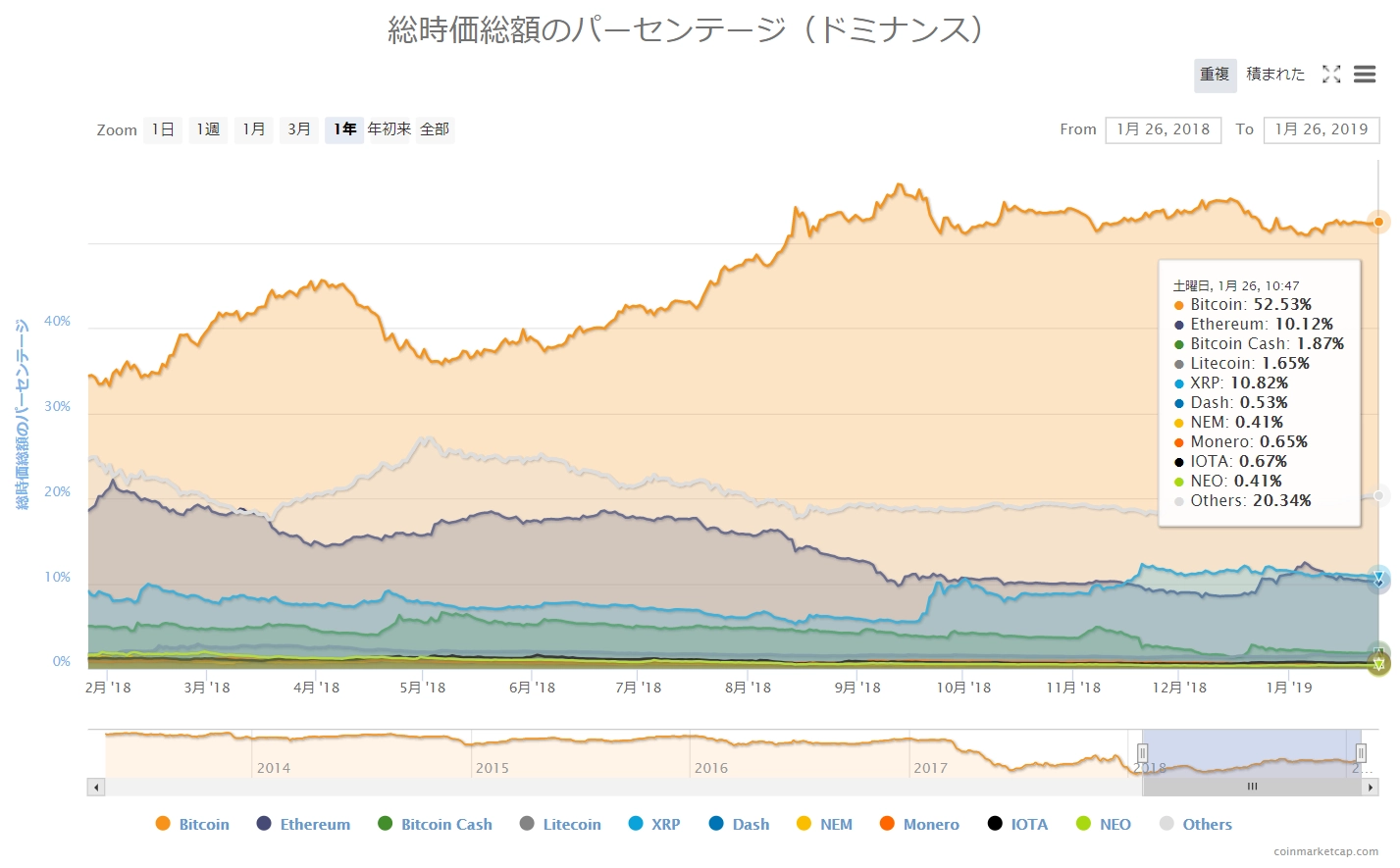 画像は2019年1月27日のキャプチャ。昨日は1~2%と弱気な相場環境となっていました。その環境が続き、今日も全面的に「赤」となっています。主要どころで1~3%の下落です。