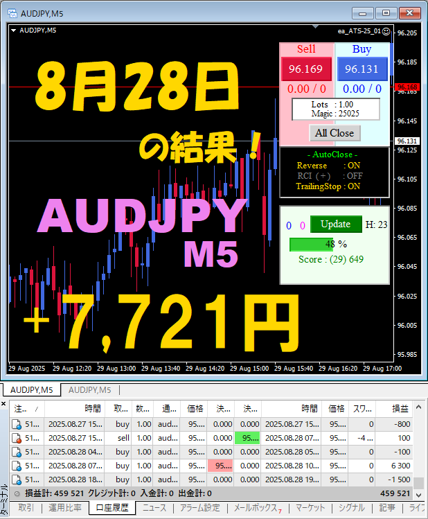 【前日の結果】AUDJPY M5 『ATS-25』8月28日