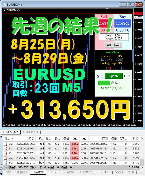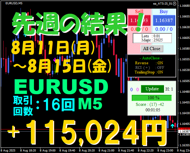 【先週の結果】EURUSD M5 『ATS-25』8月25日(月)~8月29日(金)