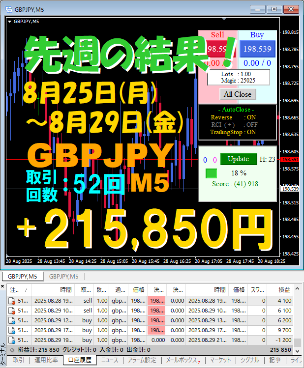 【先週の結果】GBPJPY M5 『ATS-25』8月25日(月)~8月29日(金)