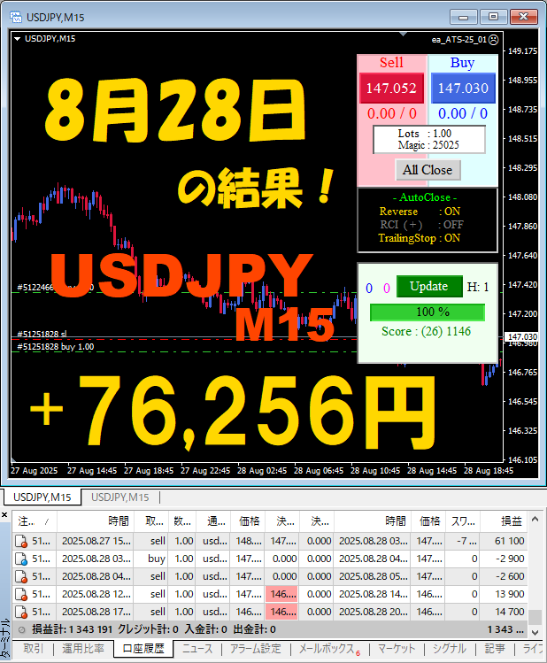 【USDJPY M15】前日の結果『ATS-25』 8月28日