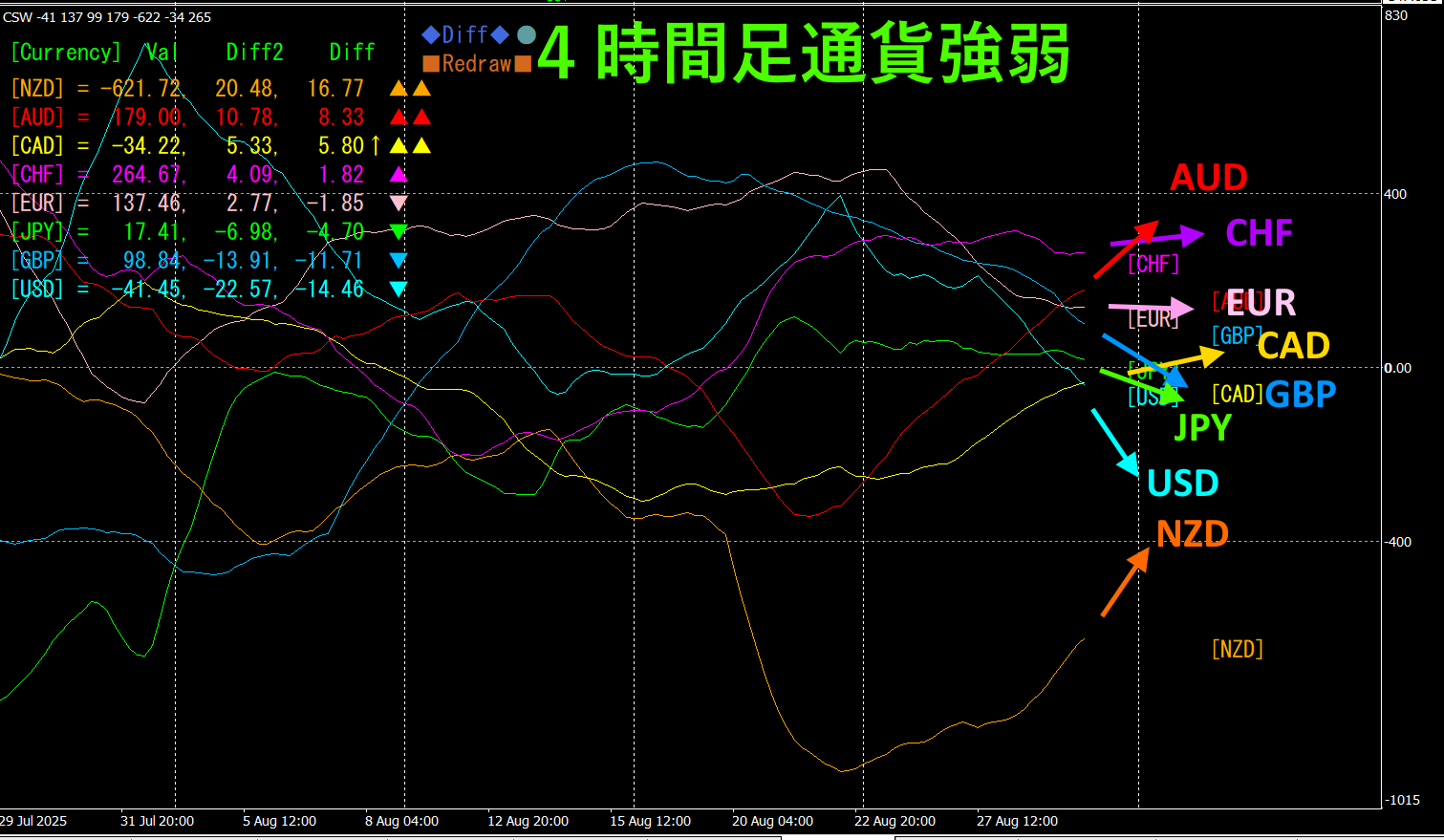 4時間足では、NZD、AUD、CAD、CHFが上向きに、USD、GBP、JPY、EURが下向きになっています。