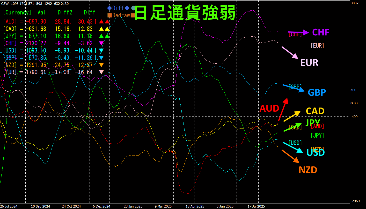AUD、CAD、JPYが上向きです。一方、EUR、NZD、GBP、USD、CHFが下向きになっています。日足では、AUDの上昇が目立っています。
