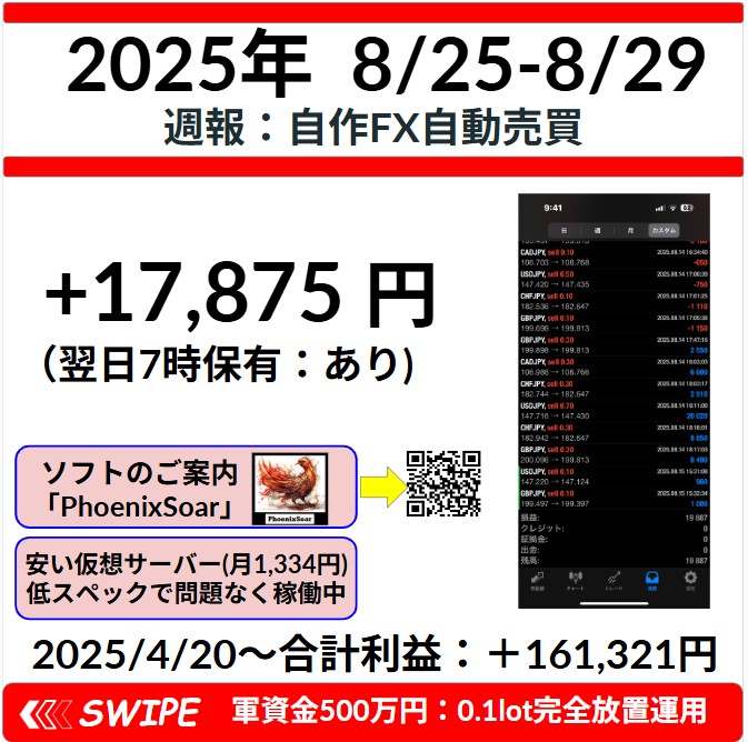 【週報:2025.8.25-2025.8.29】オリジナルEA「PhoenixSoar」の成績報告