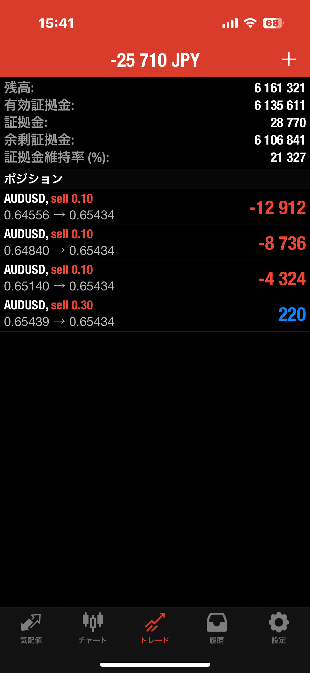 【コメント】落ち着いた相場でしたが保有したままの通貨ペアAUDUSDが変動なく保有続けています。
