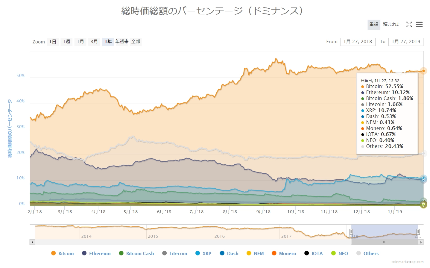 画像は2019年1月28日のキャプチャ。一昨日、昨日と連日、全面的に「赤」となっています。それが継続し、主要どころで1~5%の下落です。イーサリアムが3%、ビットコインキャッシュが4%超と下げ幅を広げています。
