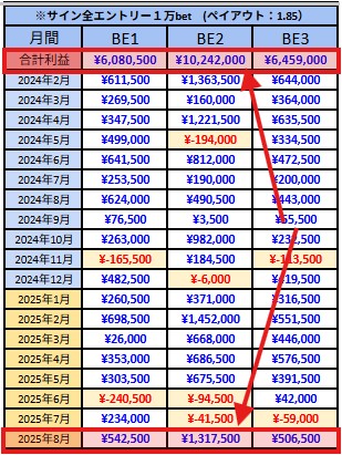 (※ペイアウト1.85 サイン全エントリー 1万bet想定)