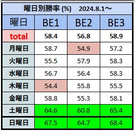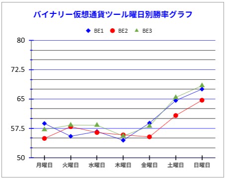 バイナリー仮想通貨1分判定用「BE」は、8時~翌朝5時までの勝敗と曜日別の結果も集計しております。