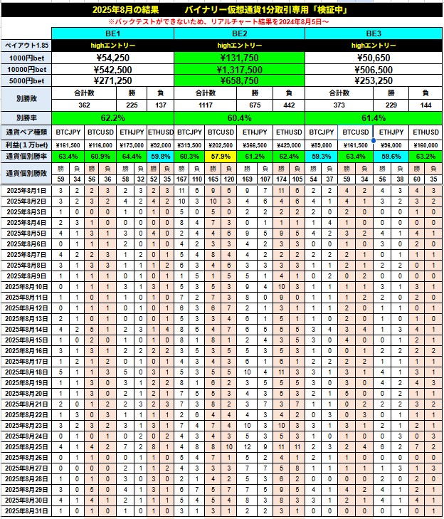 【月間結果:8月】バイナリー仮想通貨1分足判定用 オリジナルツール「BE」 BE2は、2024.2月~サイン通りで1000万円超え!