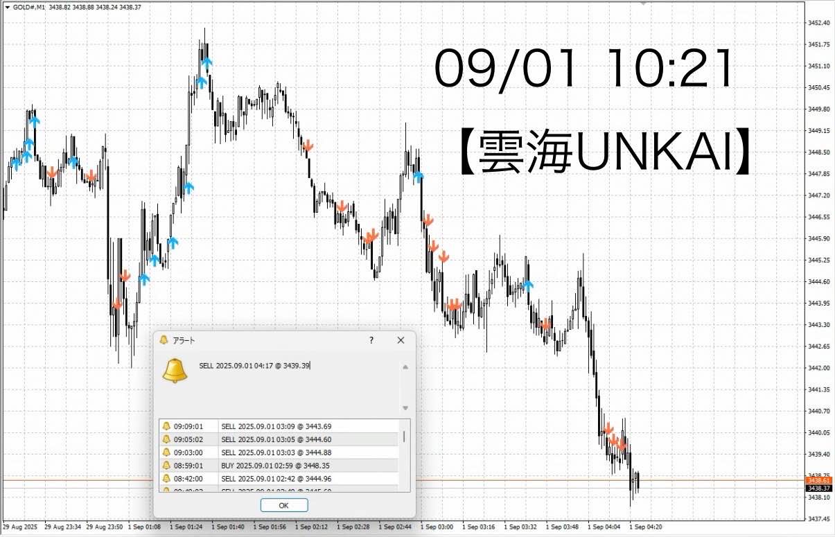 9月 1日(金)10時20分のGOLD1分足に「雲海UNKAI」を適用したチャートです。