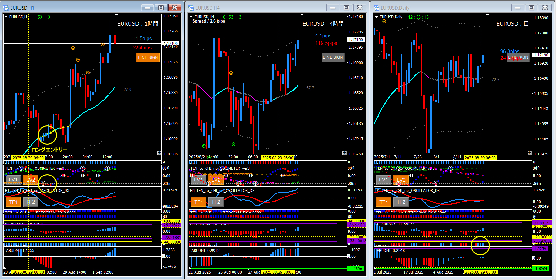 今回は日足のABUADX_DXのみを根拠に1時間足でロングエントリーを狙っていきます。ちょうどオシレーターサイン①とラインタッチが重なる所がありますね。押し目や戻りを狙っている時限定ですが、このような場所は優位性の高いエントリーポイントなので見逃さないようにしましょう。