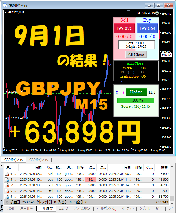 【GBPJPY M15】前日の結果『ATS-25』 9月1日