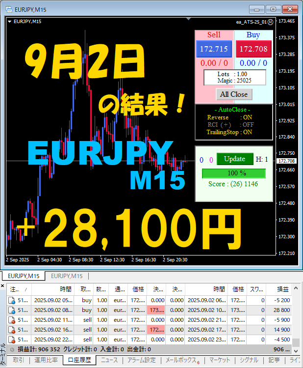 【EURJPY M15】前日の結果『ATS-25』 9月2日