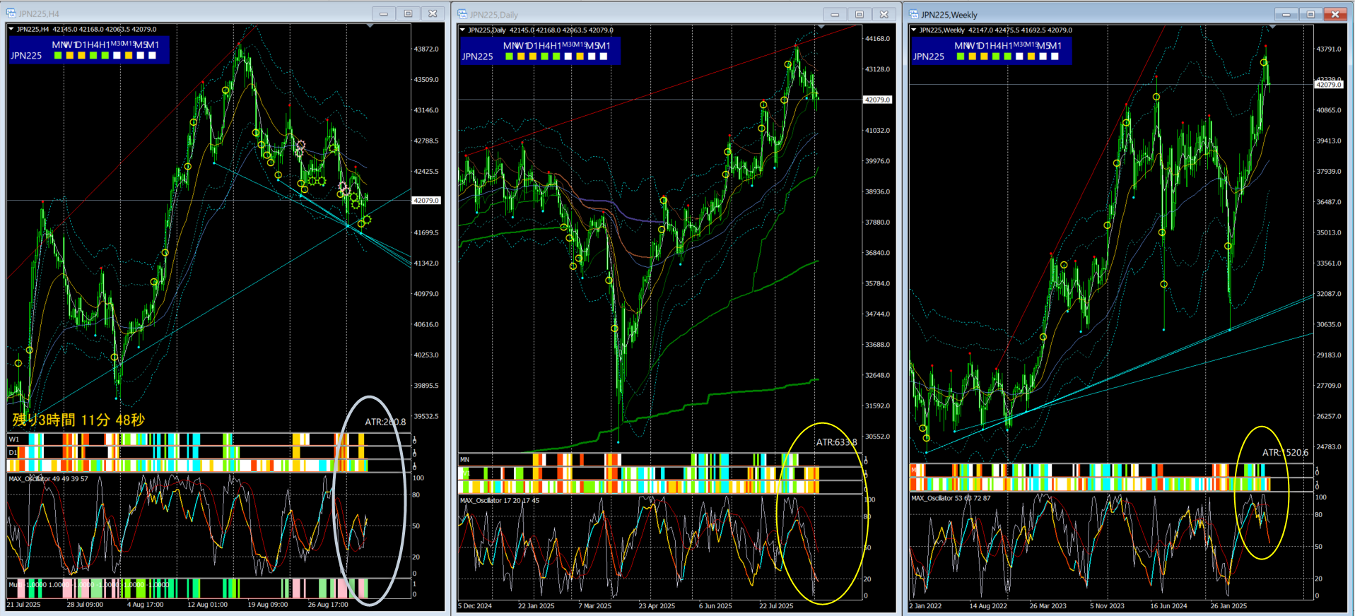 一方で、週足のMAXオシレーター、シンクロバンドは「弱い下落」を示唆