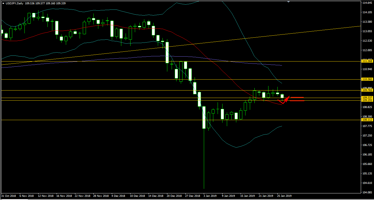 ドル円の日足チャートから見てみます。ドル円日足では、先日109.337円のすぐ下のレジスタンスラインであるドル円109.193円まで値が推移しましたがやはり以前からこのダブルのレジスタンスラインはかなり強めと思われており、現在はドル円109.337円まで値が弾き返されこれらのラインのあたりをウロウロさまよっている状態です。またドル円109.337円と109.193円のラインの間に入り込み上から下抜けを試みる動きになるのか、109.765円のレジスタンスラインの下から上抜けを試す為に上昇していくのかの動きになると予想されます。
