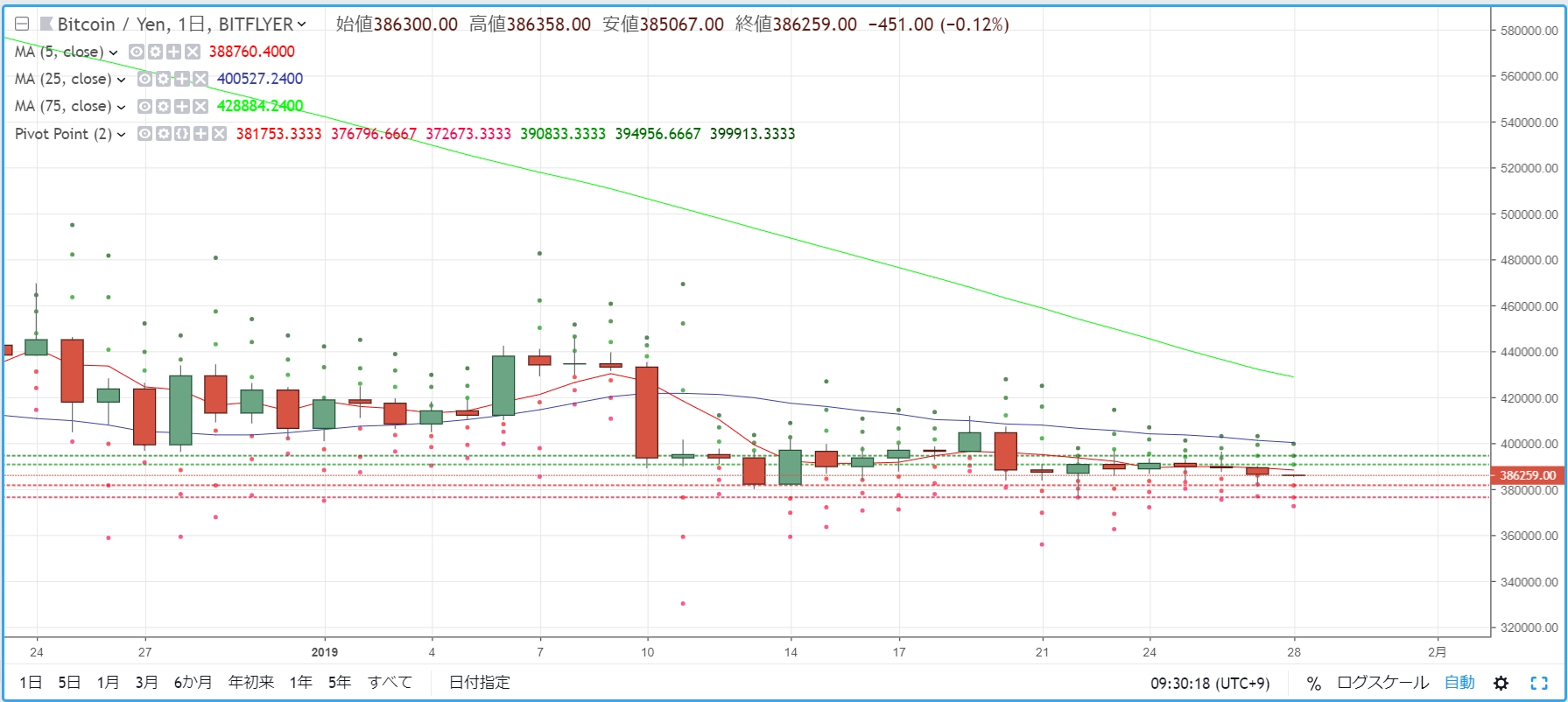 画像は2019年1月29日のキャプチャ。連日、ほとんどの銘柄が小幅にじりじりと下げて「赤」の相場環境でしたが、昨日はその下げ幅を強めて、主要銘柄で3~9%の下落となりました。リップルや約6%、イーサリアムは約8%、ビットコインキャッシュは約9%と深刻です。