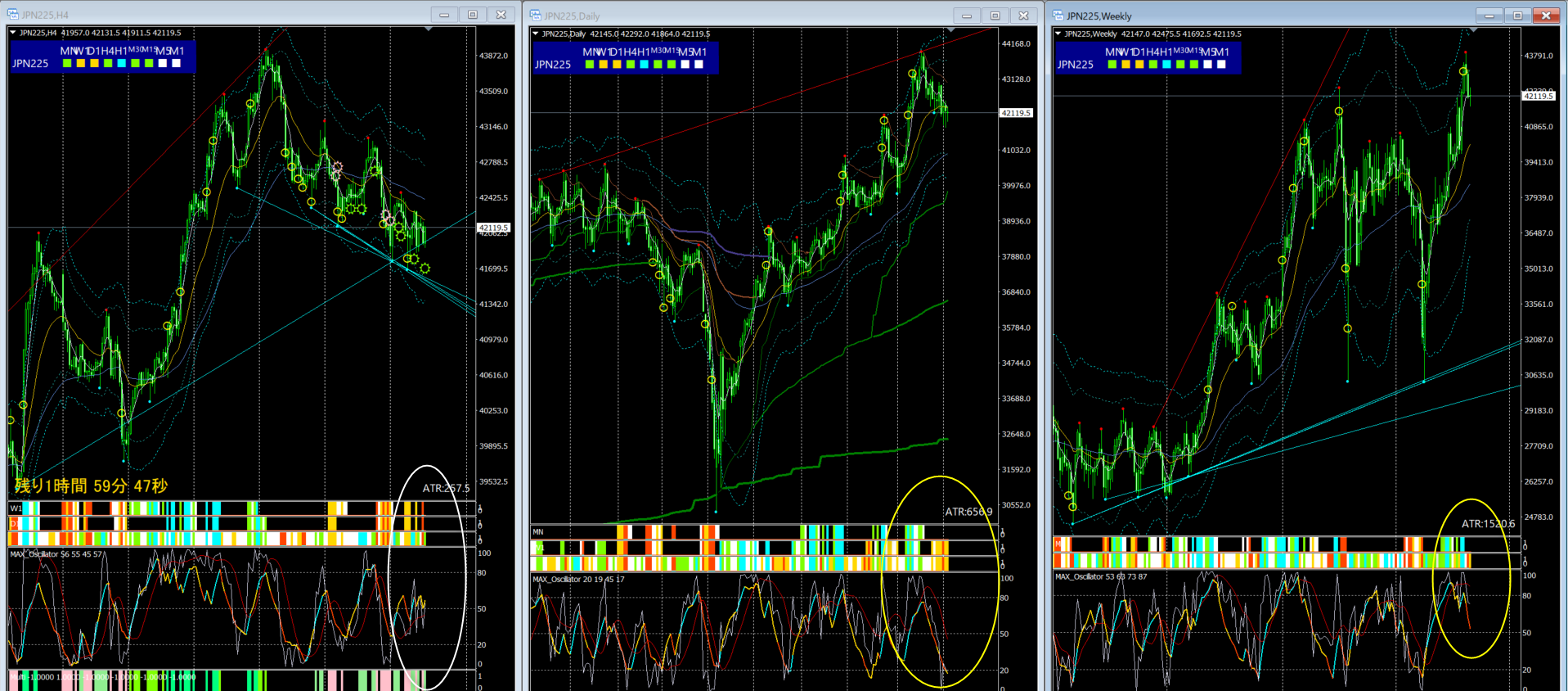 どちらかといえば、まだ下目線が妥当かと思われるが、このまま1時間足のMAXオシレーターが