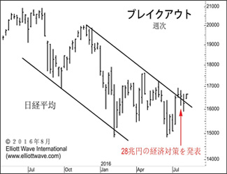 安倍政権による今回の追加的景気刺激策は、日経平均における株価の「下落調整局面」が終わった数週間後に発表されており、さらにこの発表のタイミングは、日経平均が過去1年間の下落を含むトレンドチャネルの上値抵抗線を抜けた直後にあたる。