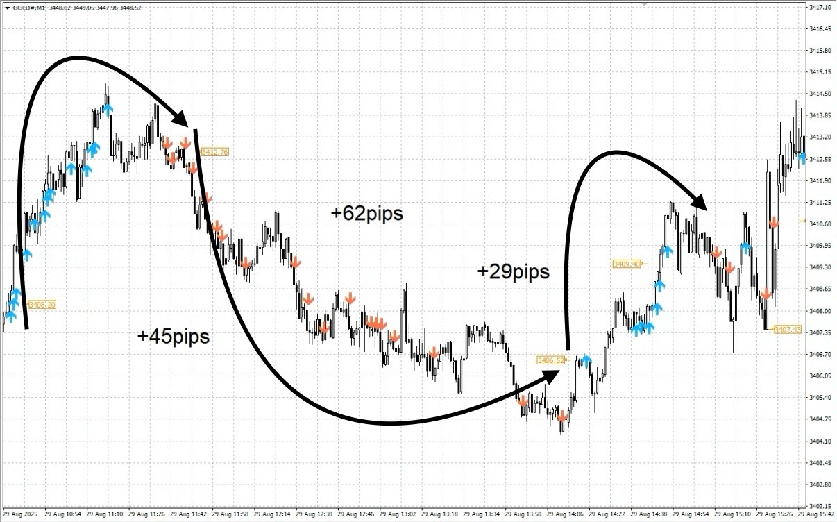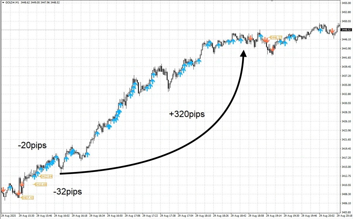 GOLD 1分足では、投資ナビの記事で「反対のサインが出るまで伸びすぎて怖い」と感じた場面よりもさらに伸びる相場があり、もしサイン通りに入っていたら逆に不安を覚えるほどの含み益が出る可能性もあります。