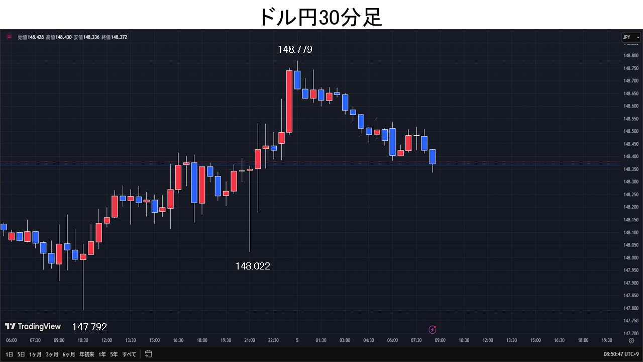 東京時間、ドル円は、一時147.79円まで下落となるが、日経平均の堅調を受け148.28円まで上昇。欧州時間、ドル円は148円台前半で揉みあい。NY時間、8月ADP雇用統計が5.4万人増と予想の6.5万人増を下振れると、ドル円は148.02円まで下押しとなるが、その後は買戻しが先行。8月米ISM非製造業景況指数が52.0と予想の51.0を上振れると、ドル円は148.77円まで上昇。