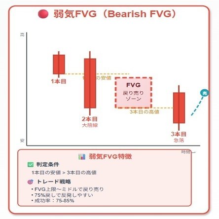つまり、弱気FVGは「機関投資家が大量の売りポジションを構築するために、個人投資家の買いを吸収する場」と解釈できます。