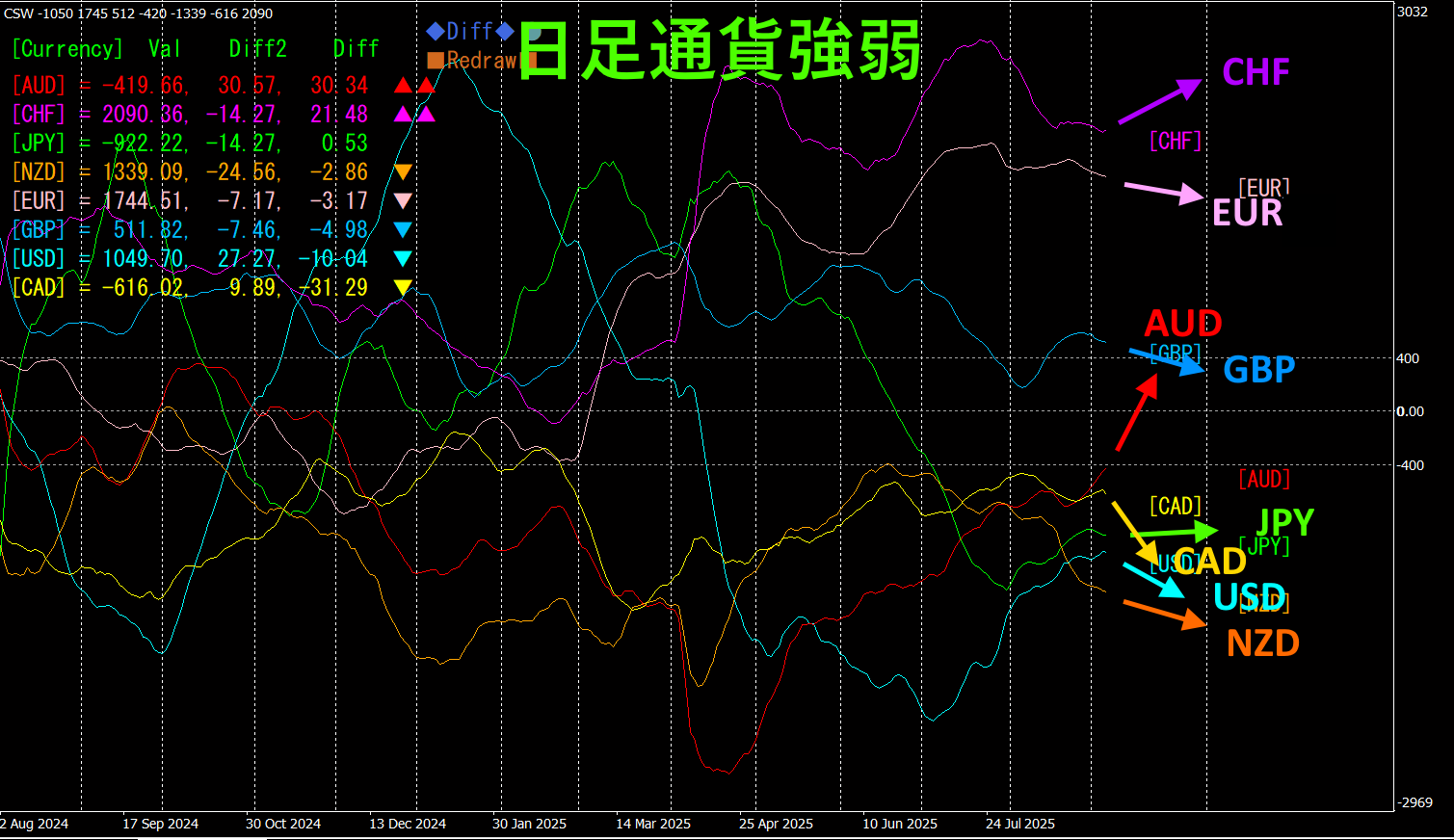 AUD、CHF、JPYが上向きです。一方、CAD、USD、GBP、EUR、NZDが下向きになっています。日足では、AUDの上昇とCADの下落が目立っています。