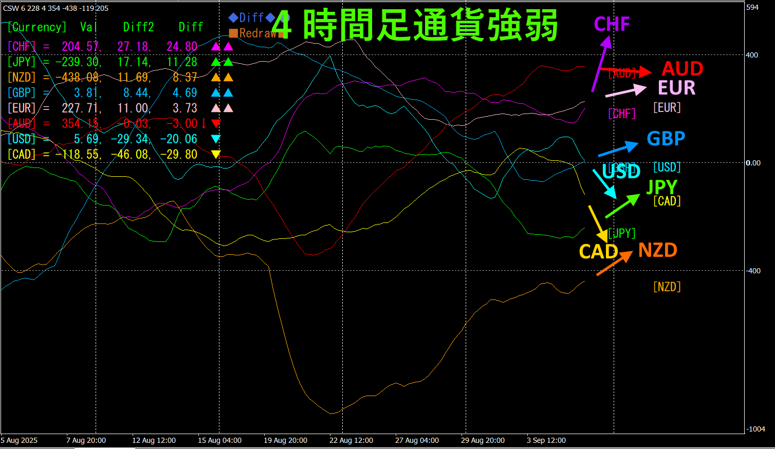 4時間足では、CHF、JPY、NZD、GBP、EURが上向きに、CAD、USD、AUDが下向きになっています。