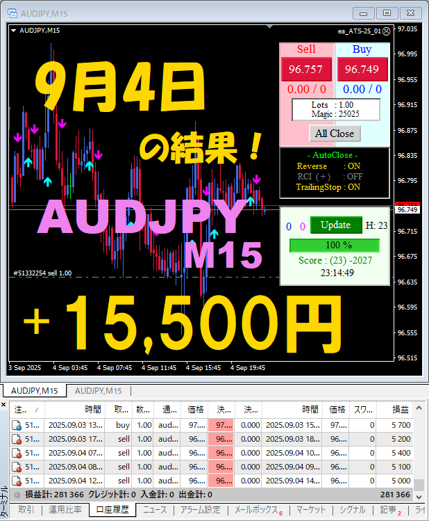 【AUDJPY M15】前日の結果『ATS-25』 9月4日