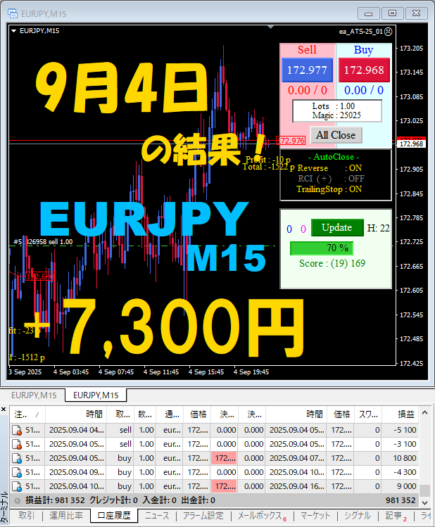 【EURJPY M15】前日の結果『ATS-25』 9月4日