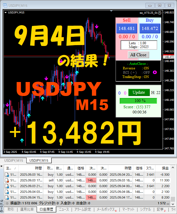 【USDJPY M15】前日の結果『ATS-25』 9月4日
