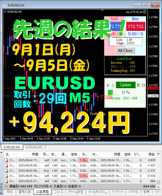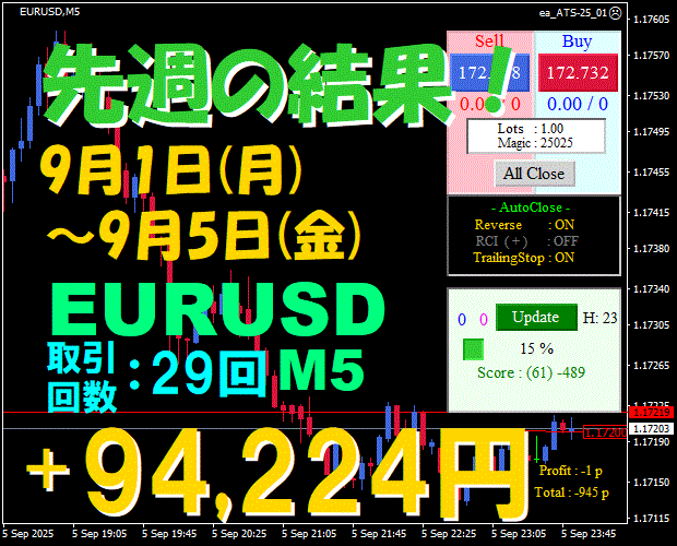 【先週の結果】EURUSD M5 『ATS-25』9月1日(月)~9月5日(金)