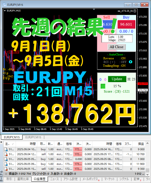 M15 週間報告!【EURJPY】ATS-25 ☆9月29日(月)~10月3日(金)