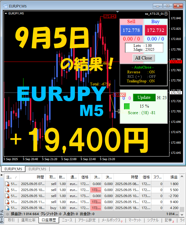 【前日の結果】EURJPY M5 『ATS-25』9月5日