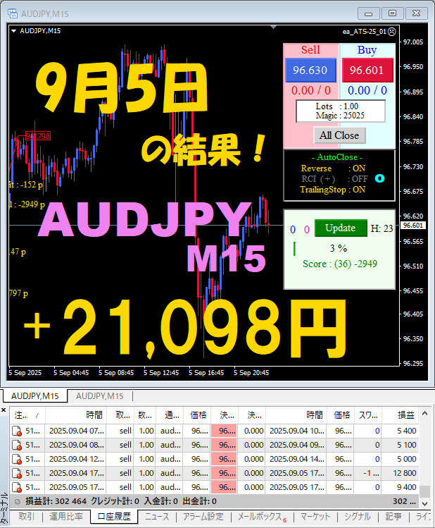 【AUDJPY M15】前日の結果『ATS-25』 9月5日