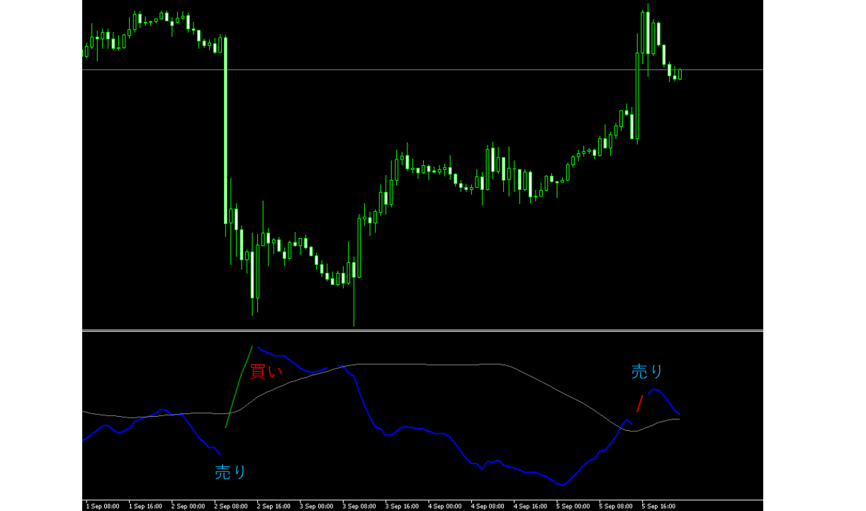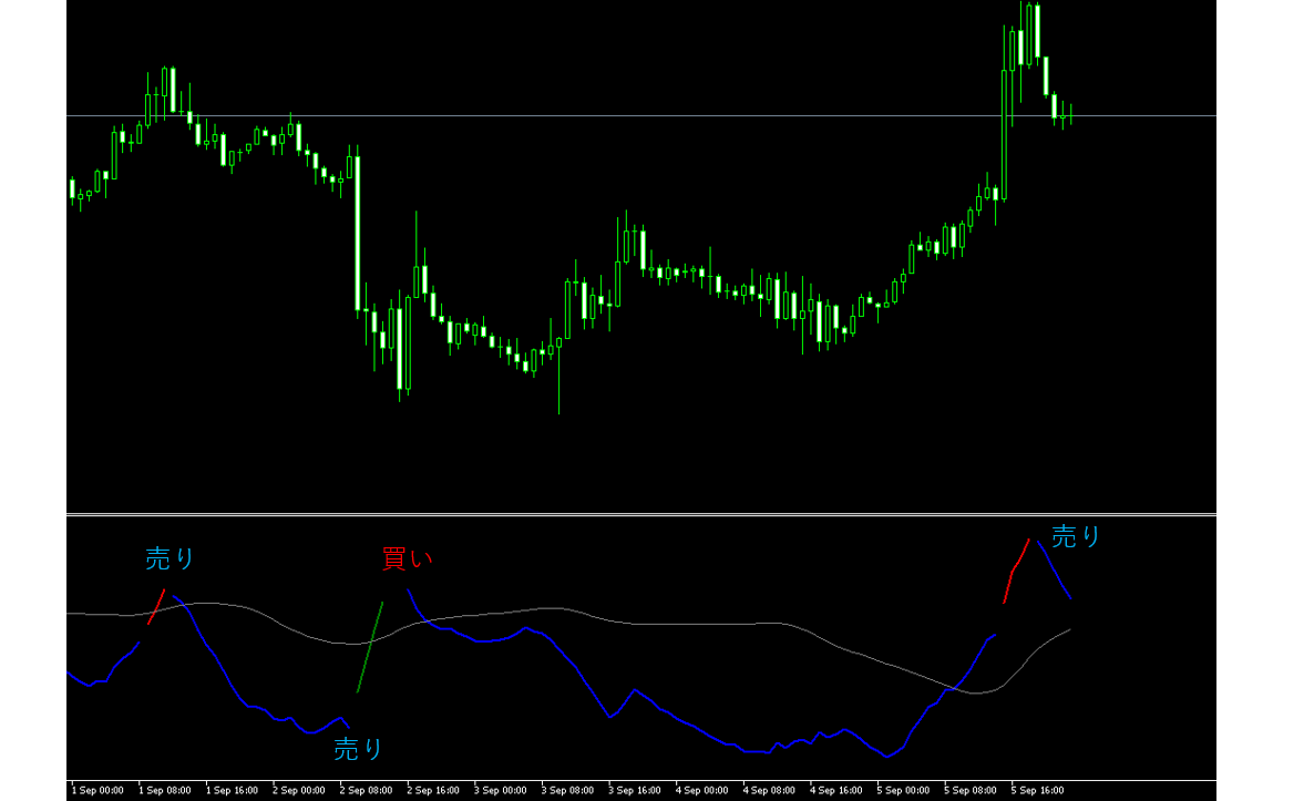 左側の「順張り売り」は大きく値を下げたところでシグナルが表示されたので、乗るには判断が分かれるところですが、