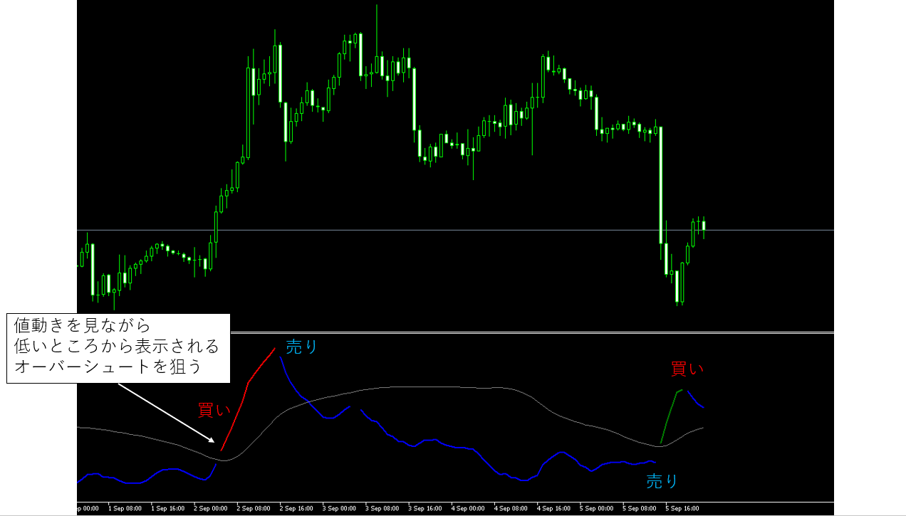 上の画像に示していますが、Overshoot表示が低いところから表示されるシグナルに順張りで乗ることが、