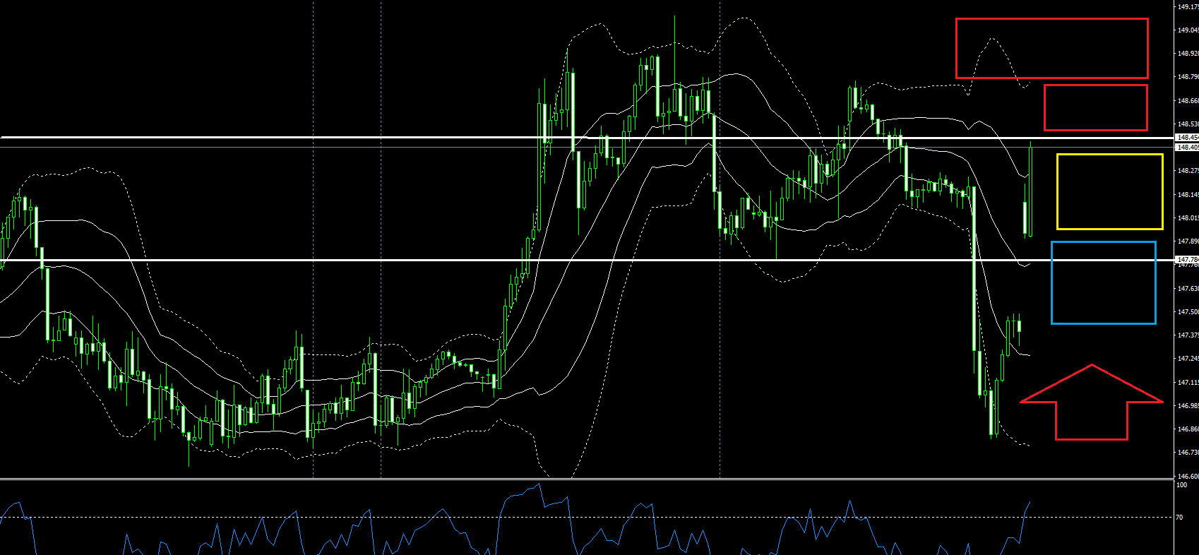 こんな感じだと思いますが、黄色・青□とも50銭位ありますので、今14850とすると、上は14900・視野は14800