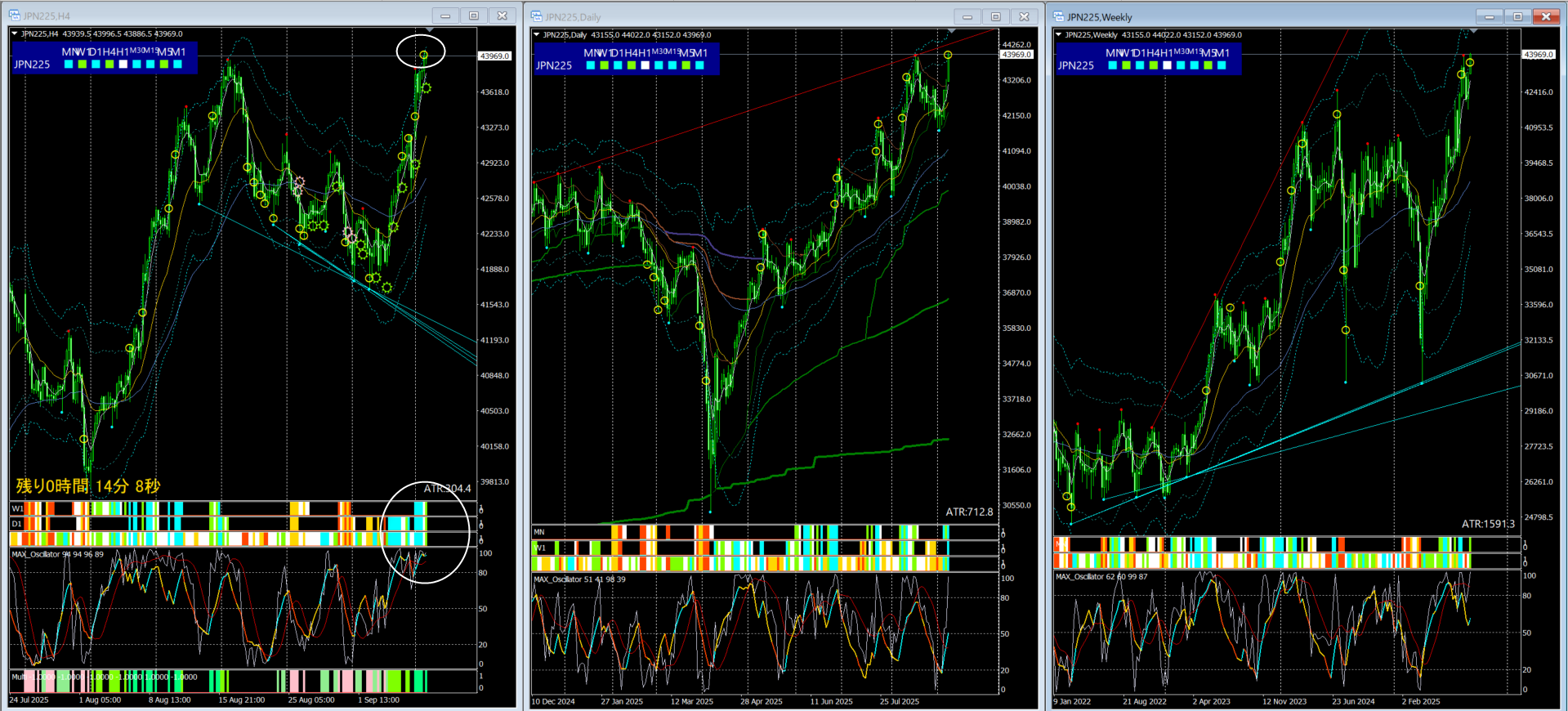 一方で、週足のMAXオシレーター、シンクロバンドは「強い上昇」を示唆