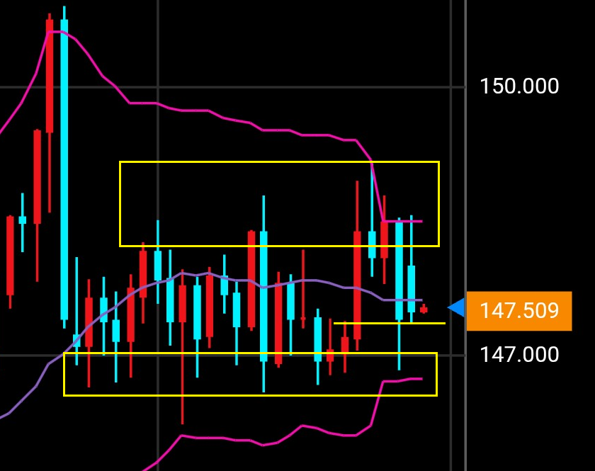 下は14700まで約50銭ありますので、今日もしそこまで下げたとしたら、14700付近で一旦買いを入れる事になります。