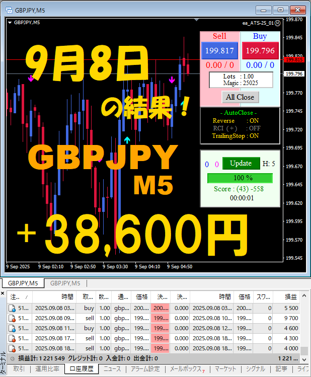 【前日の結果】GBPJPY M5 『ATS-25』9月8日