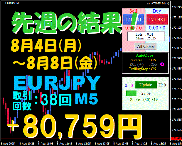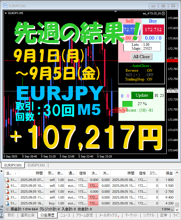 【先週の結果】EURJPY M5 『ATS-25』9月1日(月)~9月5日(金)