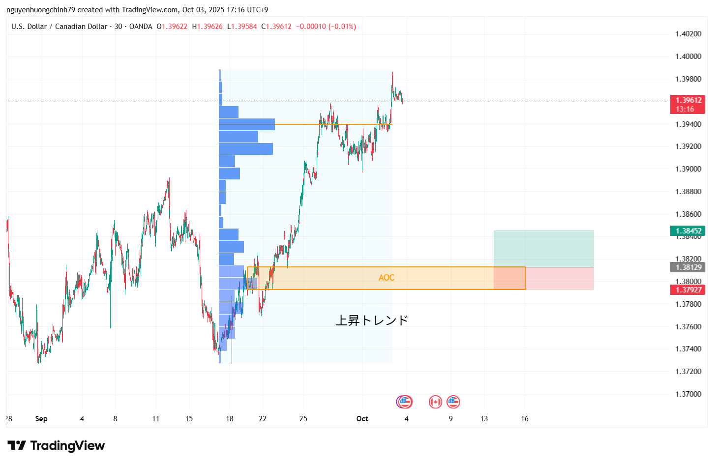 エントリー: AOCゾーン(1.38200付近)にBuy Limitを設定(チャート上のオレンジ色のゾーン)。