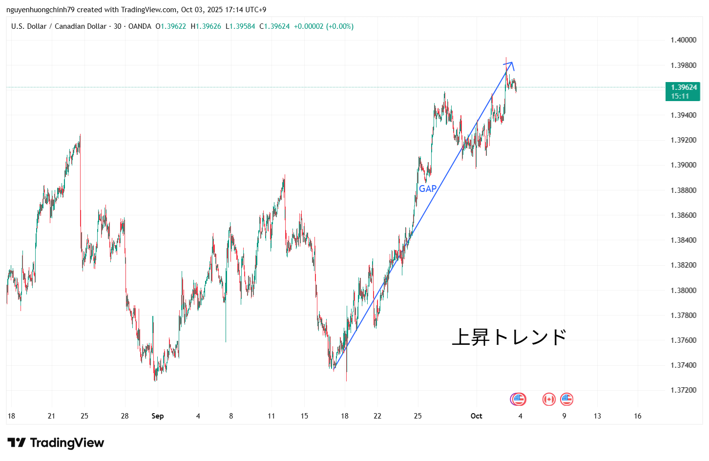 2025年10月3日、日本時間17:16、USDCADの30分足チャートを分析しました。